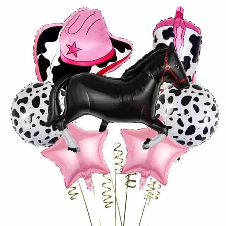カウボーイをテーマにしたアルミホイルバルーンの形状はデザイン的には多様で、核となる要素に基づいて4つのカテゴリーに分類できます。数あるデザインの中でも、ホースフォイルバルーンに代表される動物型は非常にダイナミックなデザインで、主にきめの細かいアルミフィルム素材が使用されています。