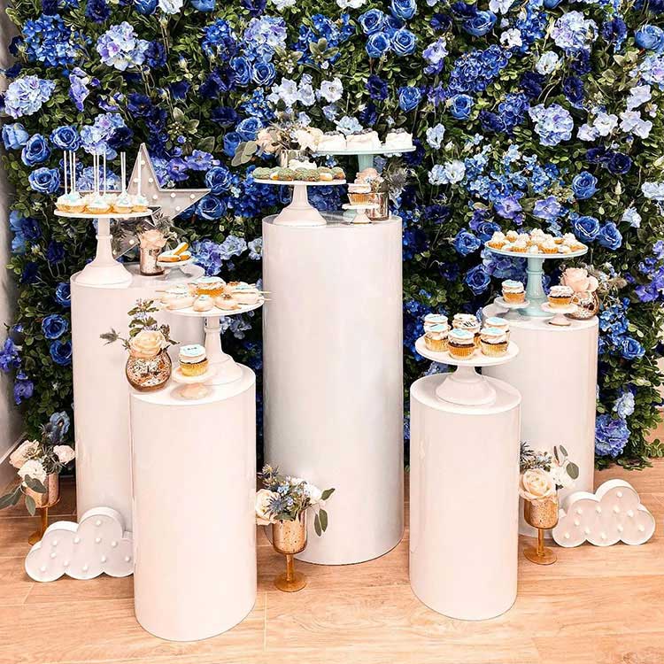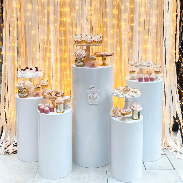 円筒形のデザートテーブルはパーティー、結婚式、誕生日イベントで使用でき、企業は芸術品、花、宝石などを展示するために使用することもできます。