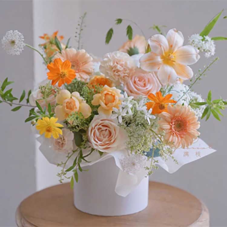 鮮やかな色:ハグバケットのデザインは、エネルギッシュで明るい色が特徴です。白、ピンク、黄色の古典的な組み合わせは、強い視覚的インパクトを生み出します。ピンク、黄色、赤、緑などの色も暖かくロマンチックな雰囲気を作り出します。これらの色は人々の注目を集めるだけでなく、ロマンチックな雰囲気を作り出します。