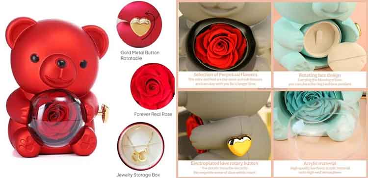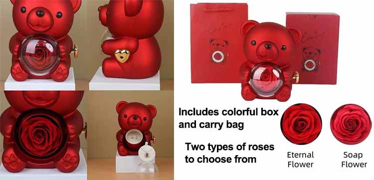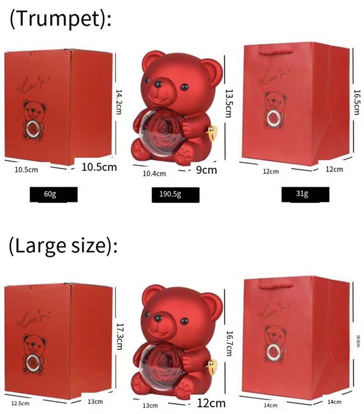 プリザーブドフラワーのサプライズハグベアは大と小の2サイズあります。ニーズに合わせてお好きなサイズをお選びいただけます!注意すべき点は、写真のネックレスとリングは撮影の小道具であるということです。2つのサイズには独自の特徴があり、あらゆる感情に合わせて適切な持ち方を見つけることができます。